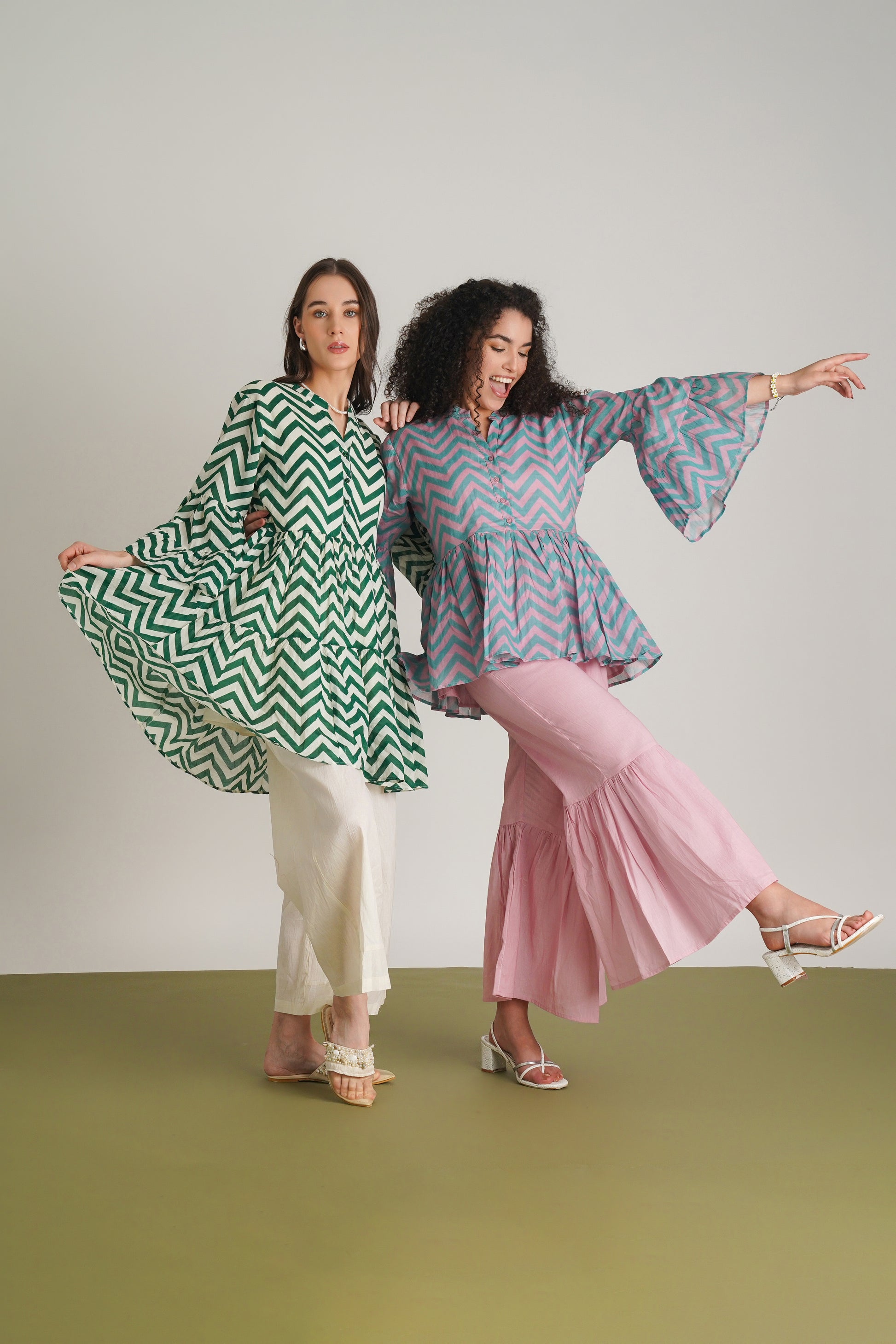 The Alma Co-ord Set is a harmonious blend of chic style and comfort, crafted from 100% cotton and featuring the finest cotton organdie fabric. The set's upper tunic is adorned with a custom diagonal stripe print and lined for added structure, offering the versatility to be worn with or without the coordinating pants. The pants, made from the same luxurious fabric and also lined, complement the tunic perfectly. Together, they create an effortlessly stylish look, with a relaxed fit that ensures comfort without compromising on elegance.