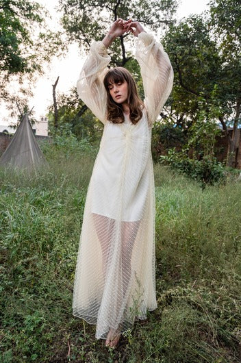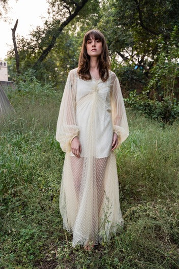 Truly spectacular long tulle dress !!, Front knoted detail with a flow of fabric right till the end, elongated Baloon sleeves with elsaticated cuff, This special fabric has been inspired from a japanase designer , which shows flow of " UMI" meaning sea . Comes with a slip dress and can be used at all occasions day wear or evening wear.