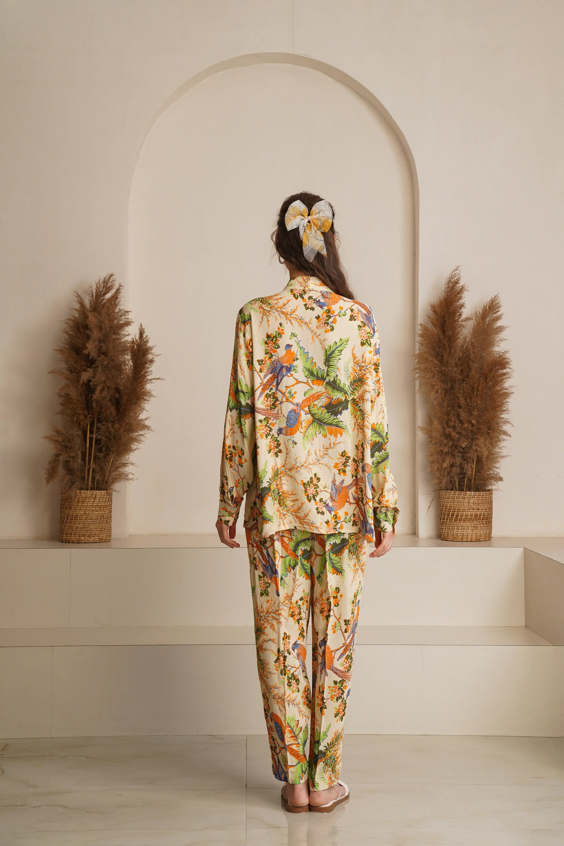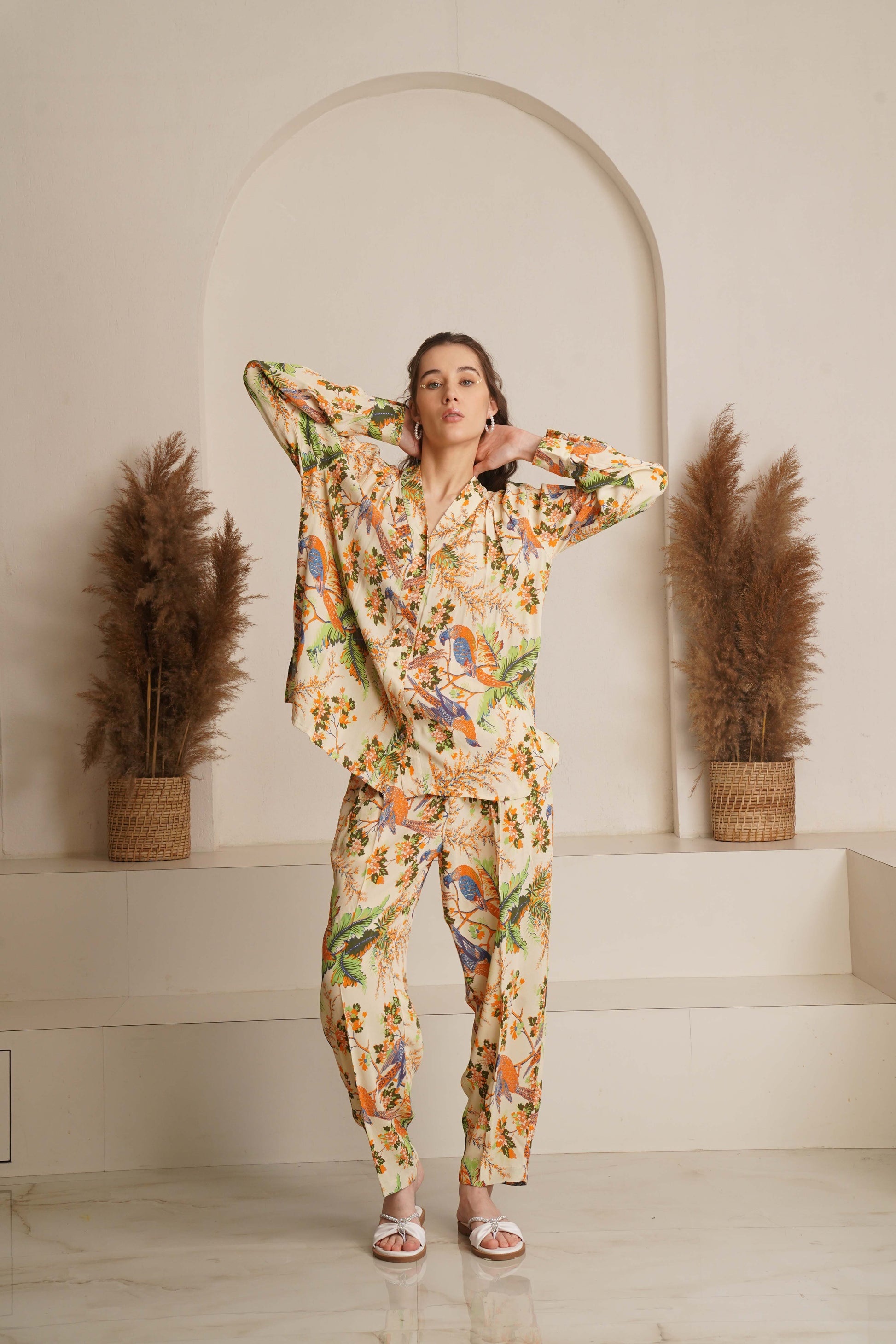 The Canary Co-ord Set is a celebration of luxury and elegance, crafted from sumptuous viscose moss crepe that drapes gracefully, embracing the body with unparalleled sophistication. Adorned with our signature Canary print, this set tells a vibrant tale of nature, with its rich colours enhancing every skin tone. The Shirt top has details on shoulders and complement a comfortable look The accompanying pants mirror the opulence of the top, completing a look that is both refined and striking. The Canary Co-ord Set is designed to make a statement, embodying the perfect blend of comfort and high-end style.