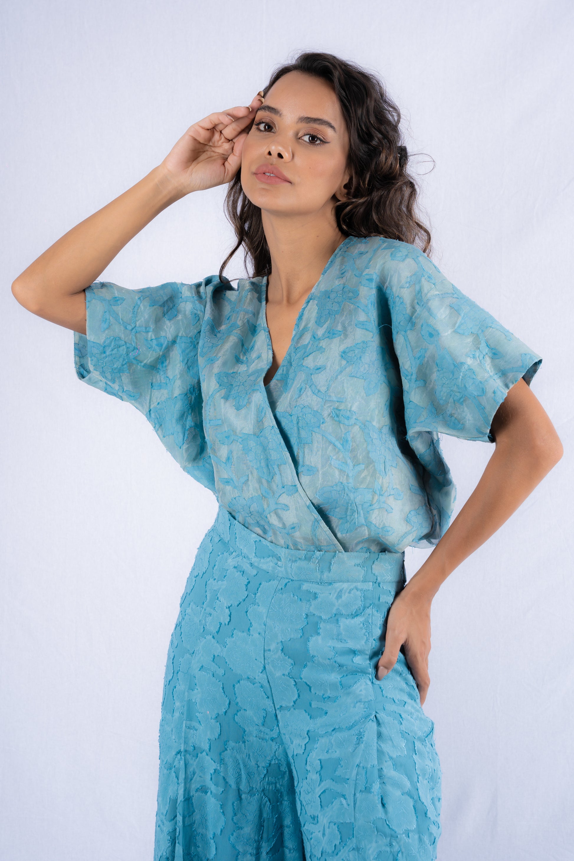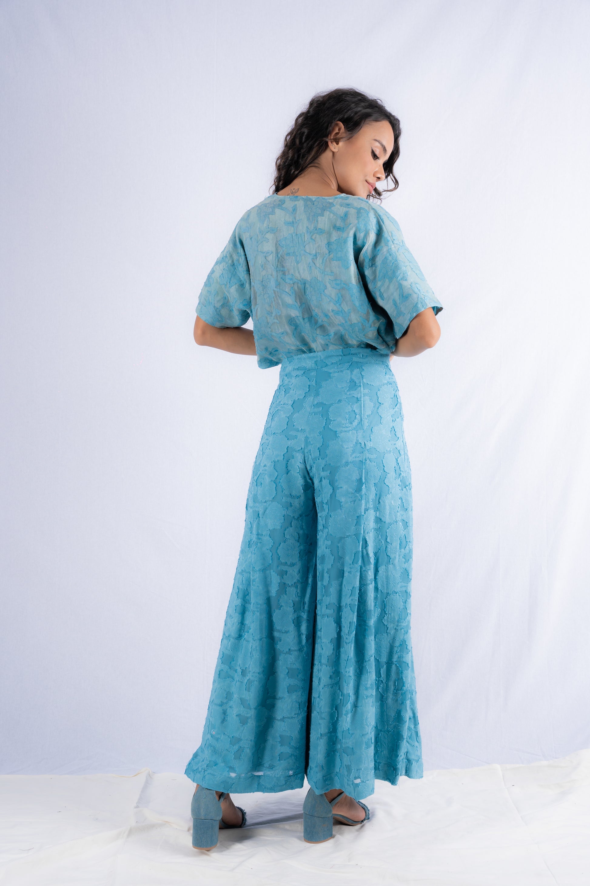 A party going co-ord set, with wrap-tie top and jacquard full flared pants