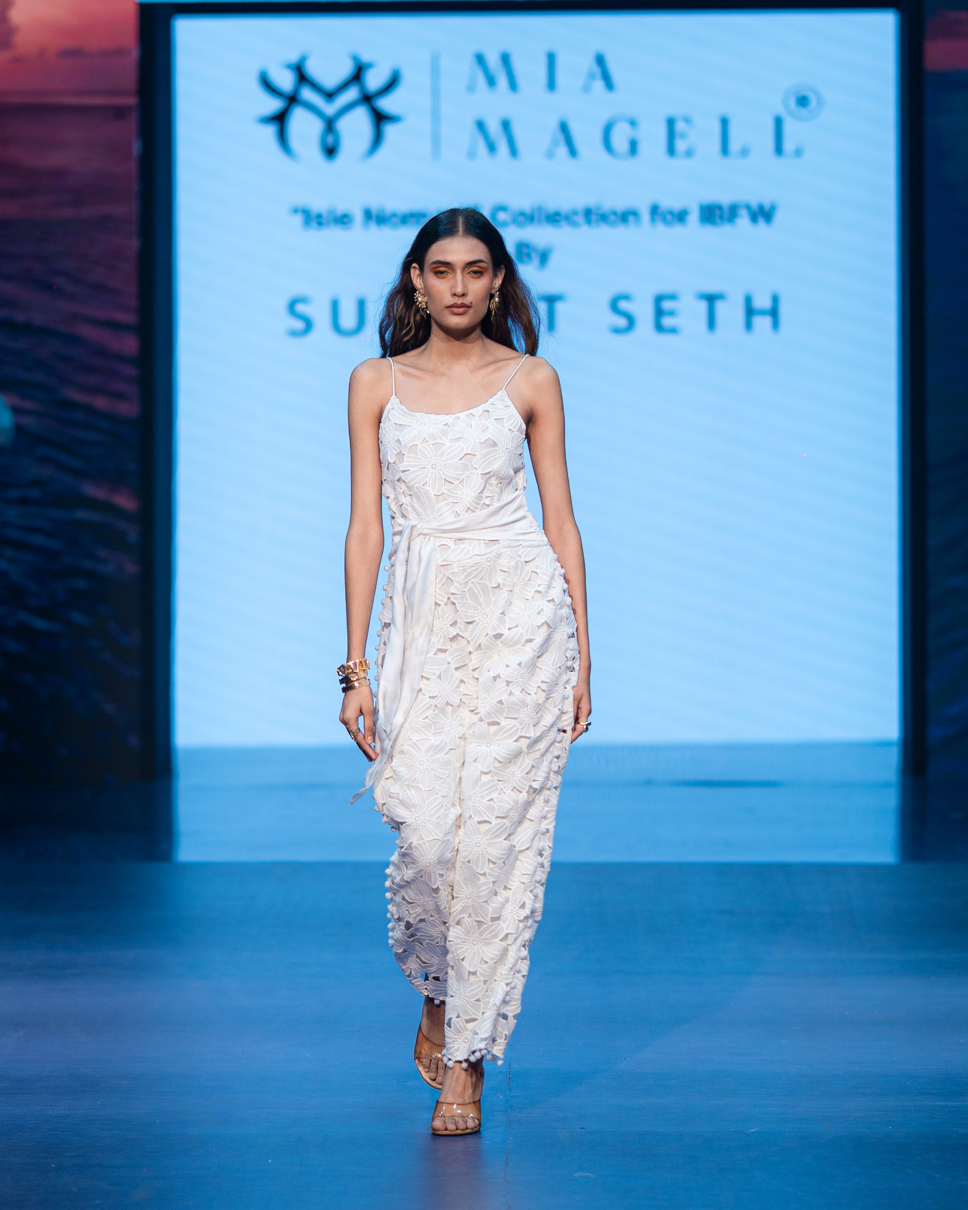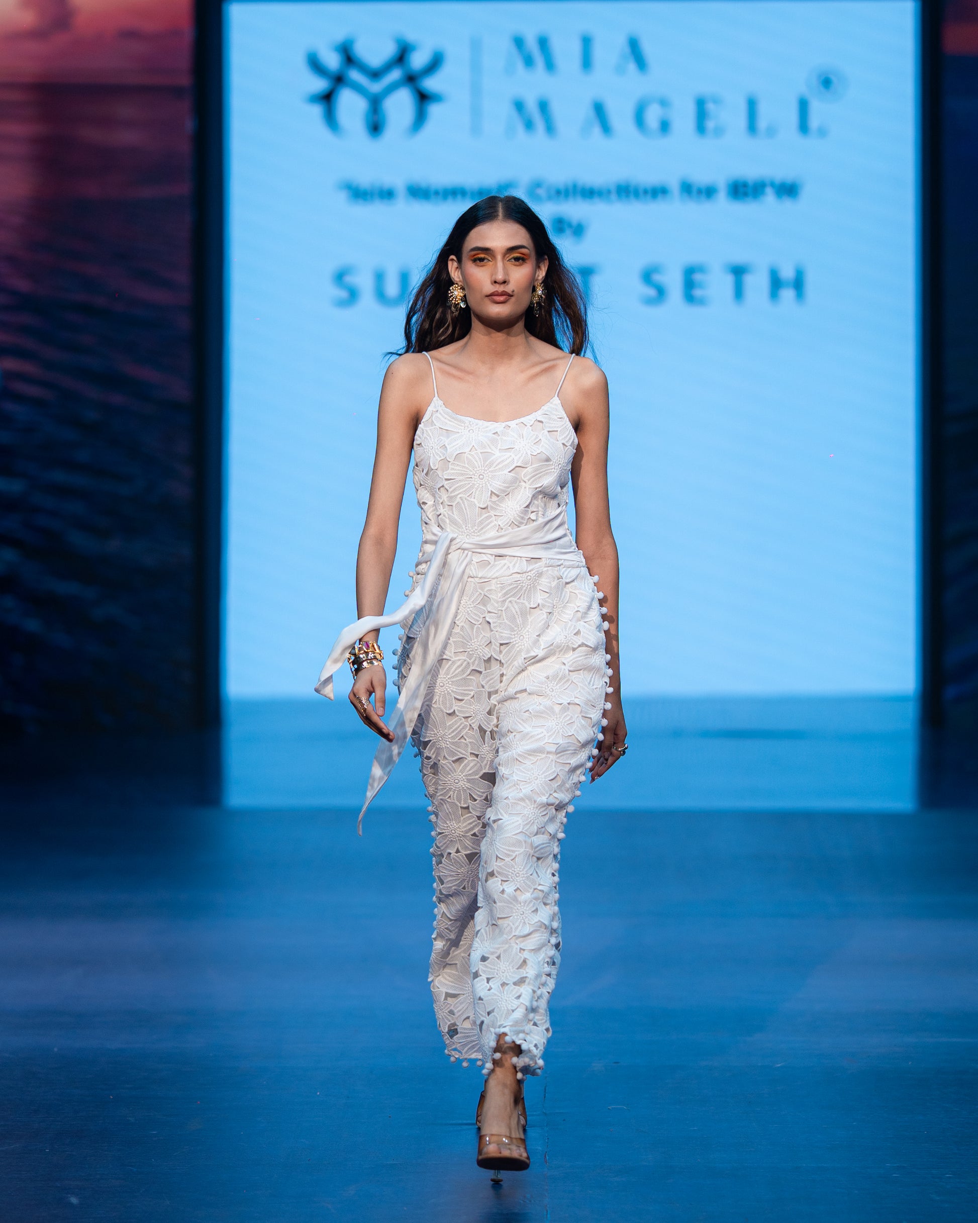 One of the many gems we have !!, A beautiful jumpsuit made out out A special Embroidered lace fabric curated for this style , Thigh length lined with cotton fabric and POM POM laces on edges. A must Have !