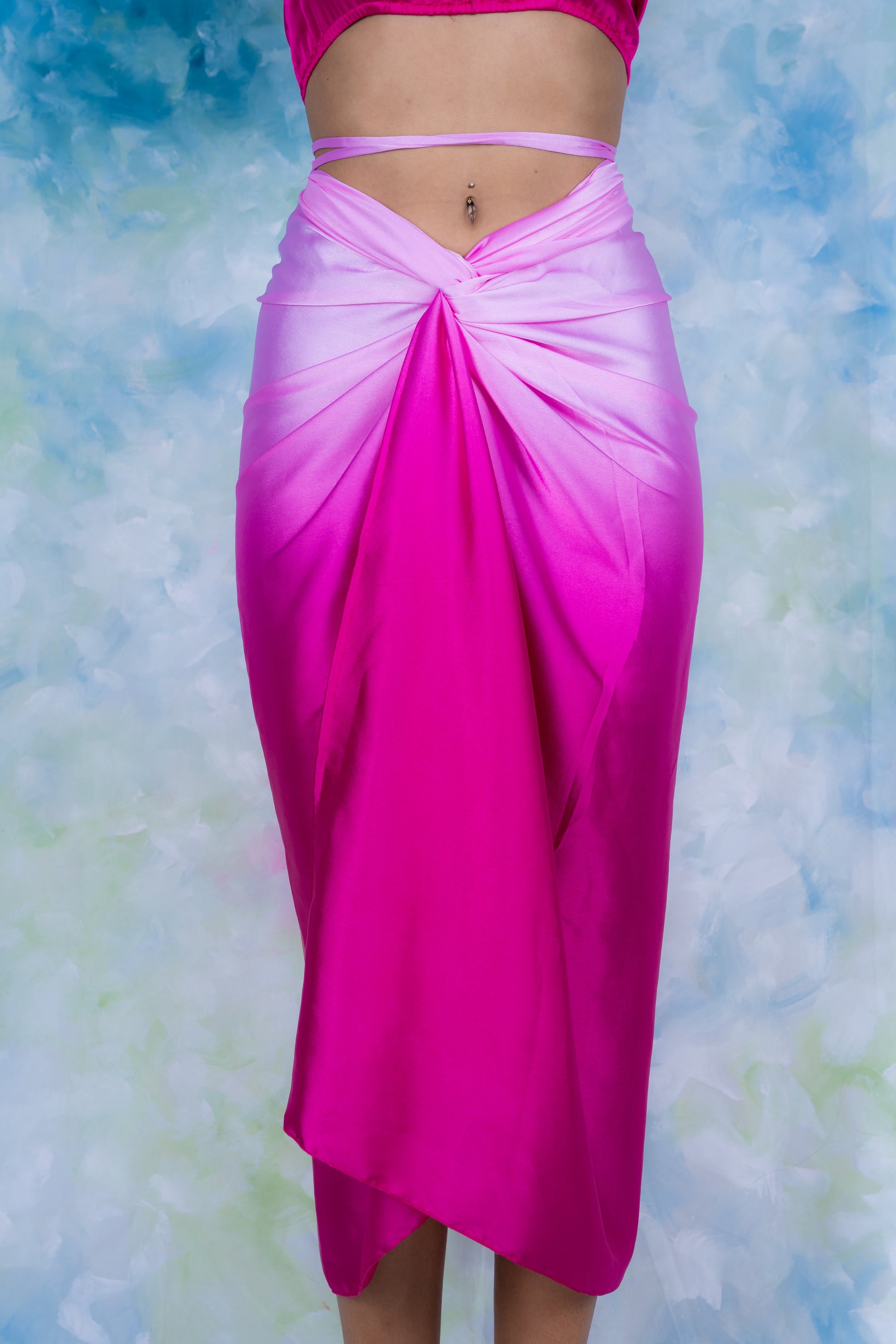 An ombre effect tie-up skirt to fit all sizes and to style differently with a chique classic backless crop top. Perfect for vacations as well as parties.