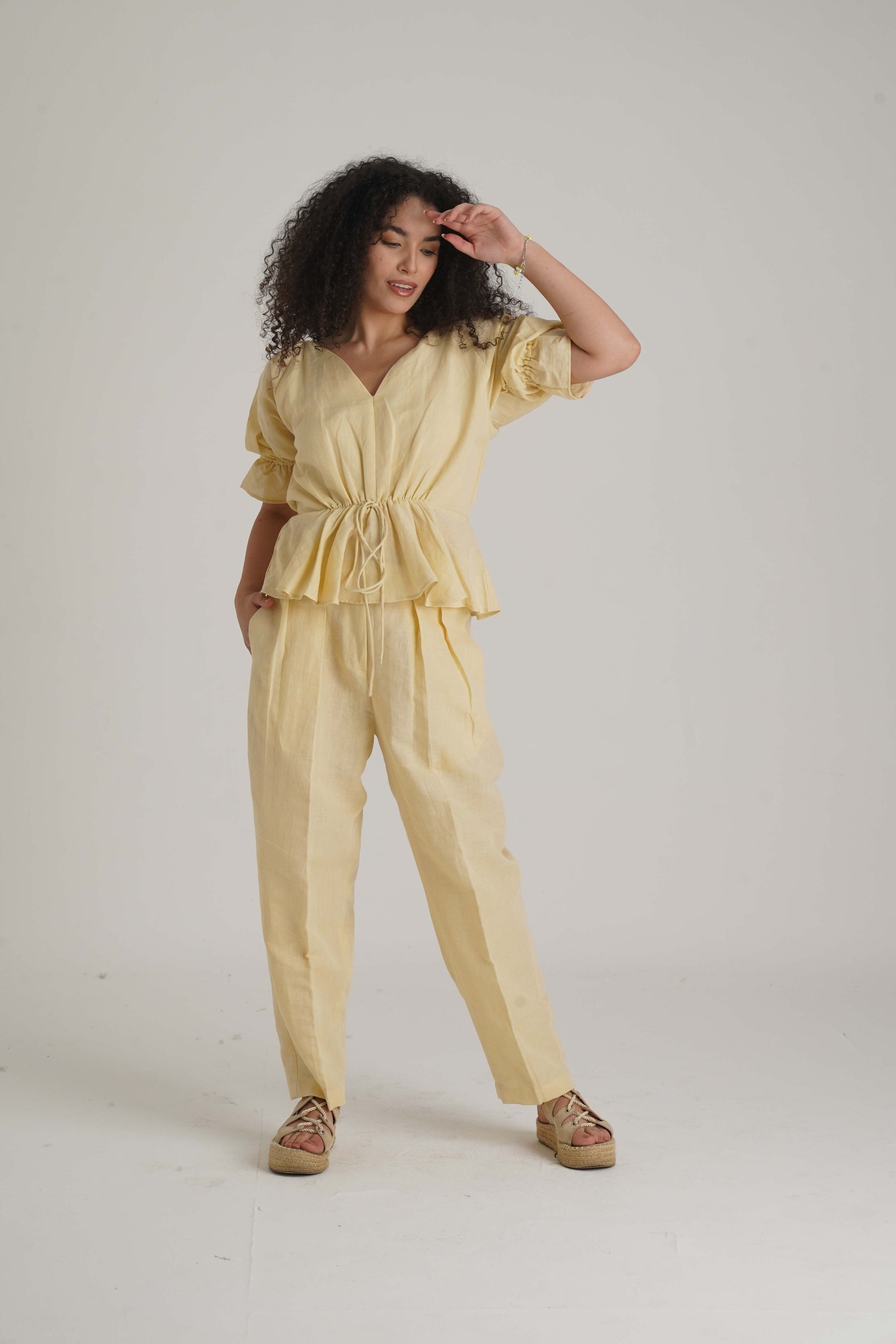 Indulge in luxury with our Sofia co-ord. Made from a linen cotton blend, it offers a luxurious feel. The V neck and waist cord add a touch of sophistication, while the fitted pants provide a smart fit with a rich look. Elevate your style with this elegant and exclusive set. Available in 4 different colours